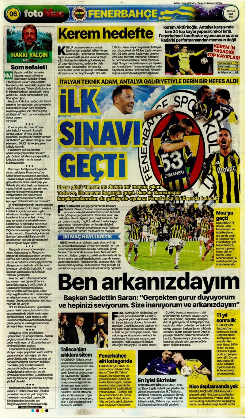 30 Eylül 2025 – Gazetelerde FENERBAHÇE