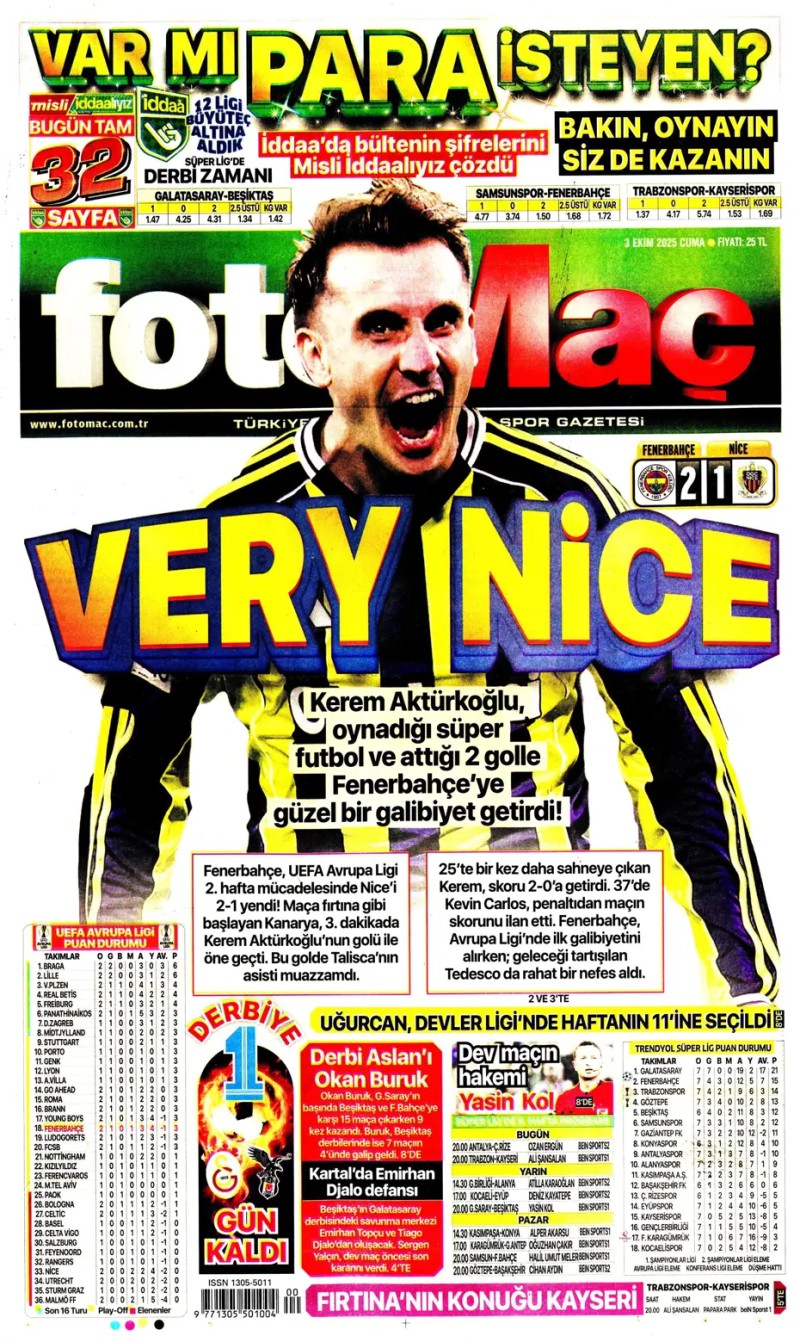 3 Ekim 2025 – Gazetelerde FENERBAHÇE