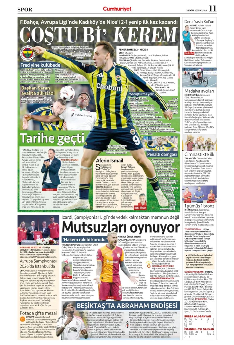 3 Ekim 2025 – Gazetelerde FENERBAHÇE