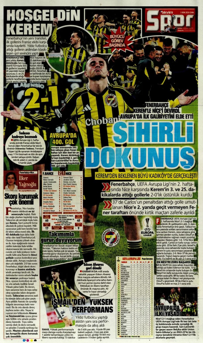 3 Ekim 2025 – Gazetelerde FENERBAHÇE