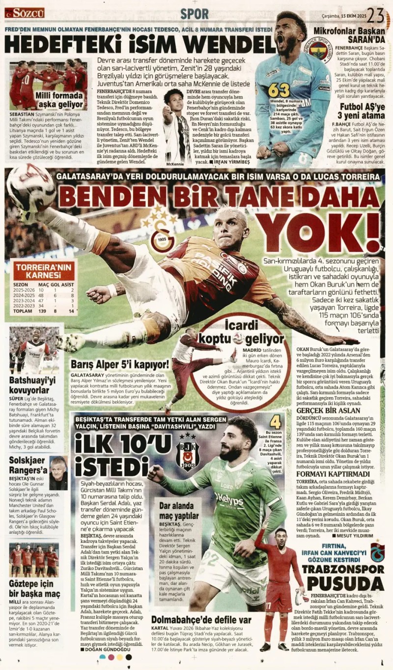 15 Ekim 2025 – Gazetelerde FENERBAHÇE