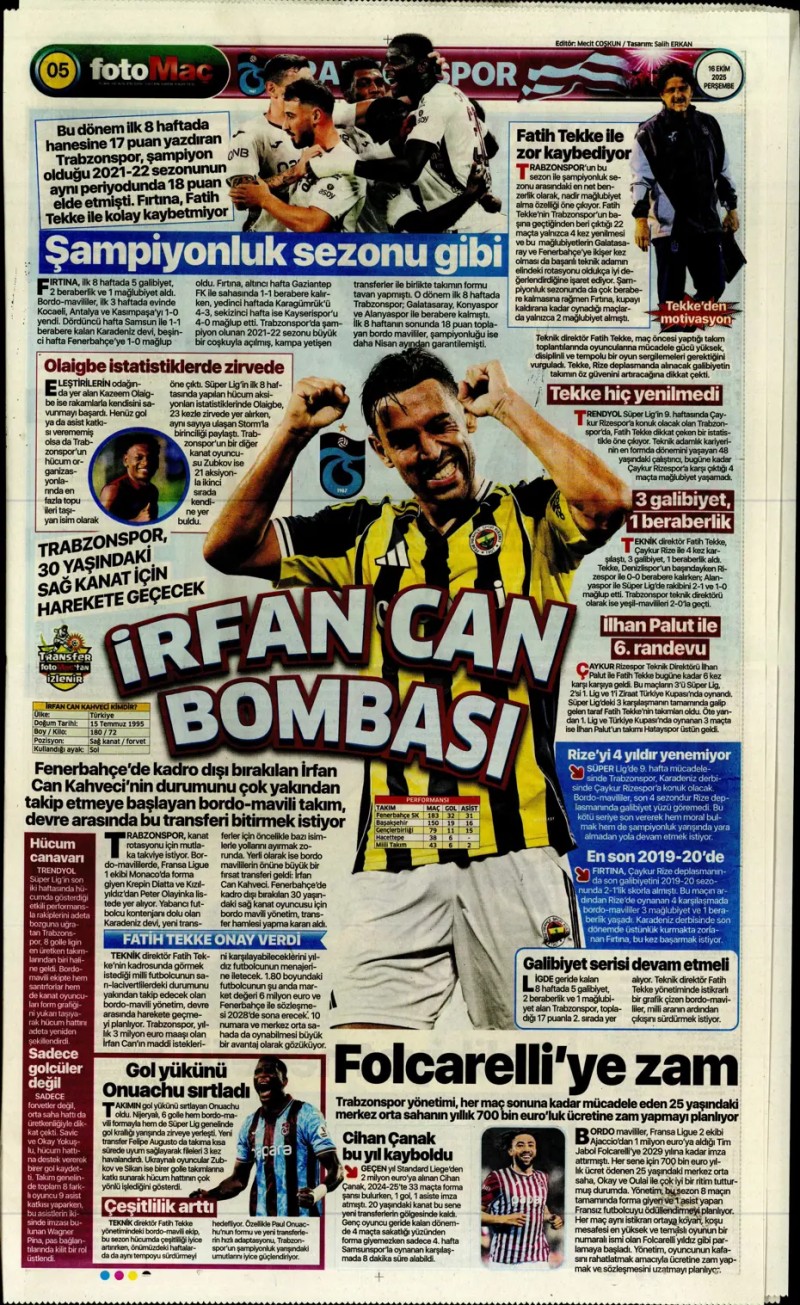 16 Ekim 2025 – Gazetelerde FENERBAHÇE