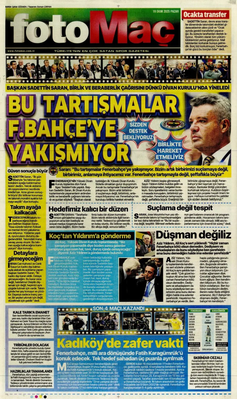 19 Ekim 2025 – Gazetelerde FENERBAHÇE