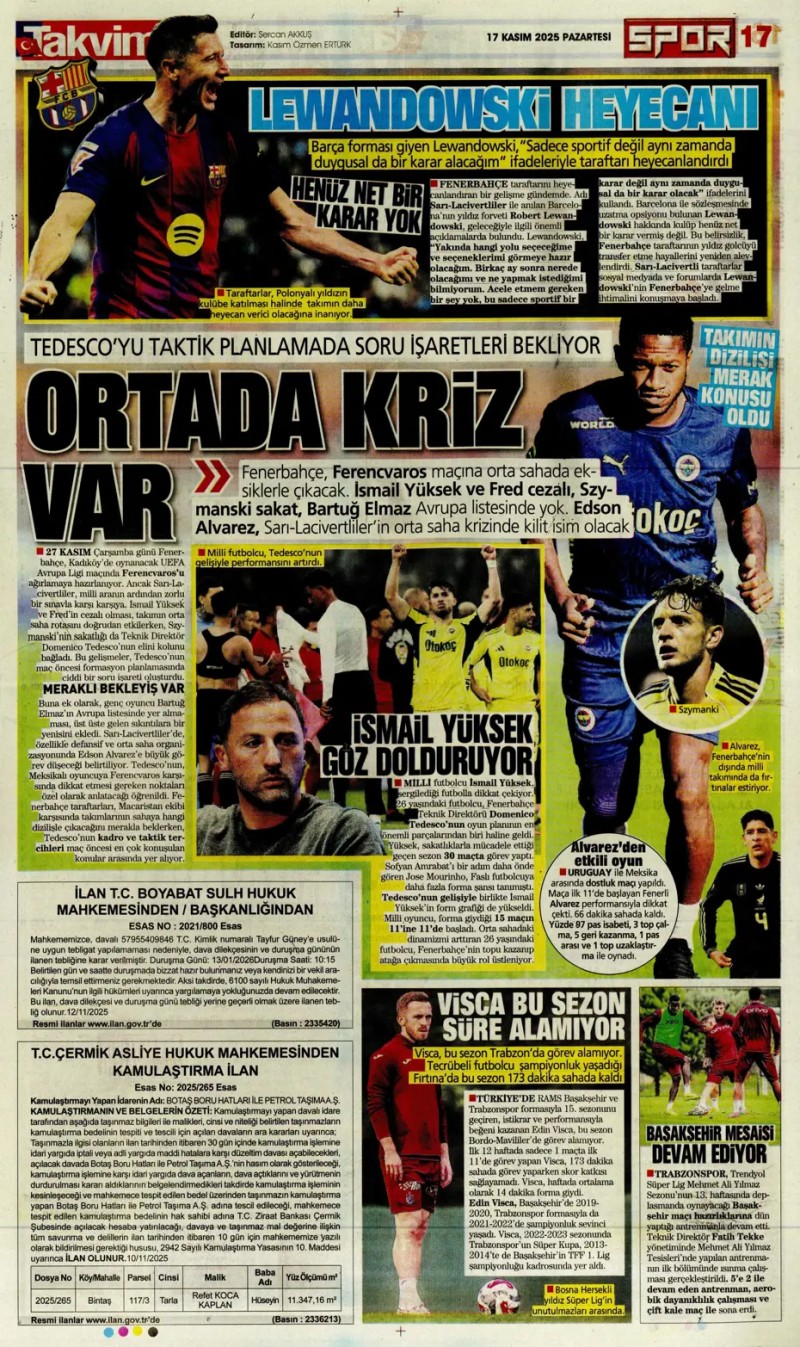 17 Kasım 2025 – Gazetelerde FENERBAHÇE