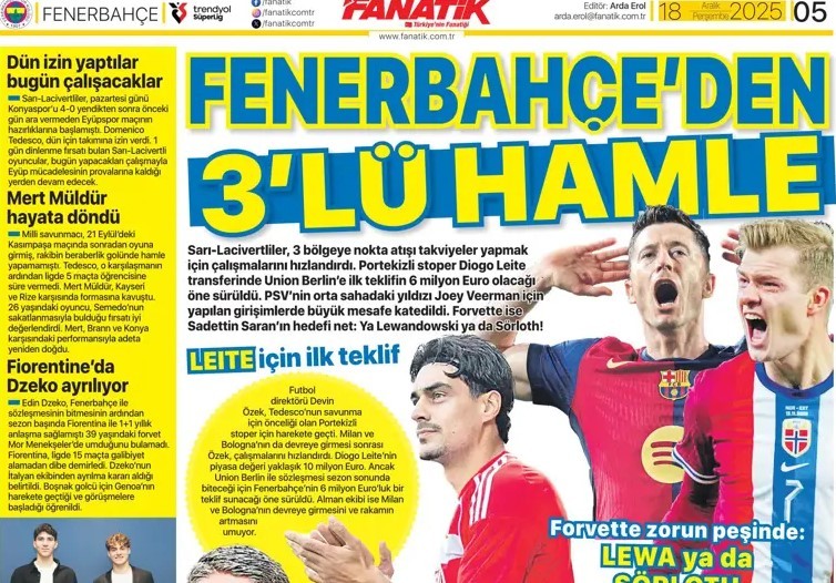 18 Aralık 2025 – Gazetelerde FENERBAHÇE