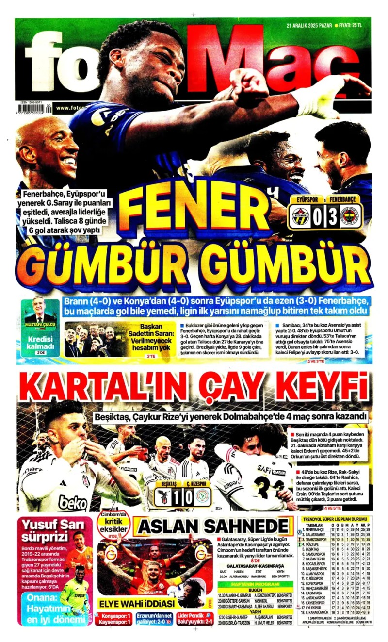 21 Aralık 2025 – Gazetelerde FENERBAHÇE