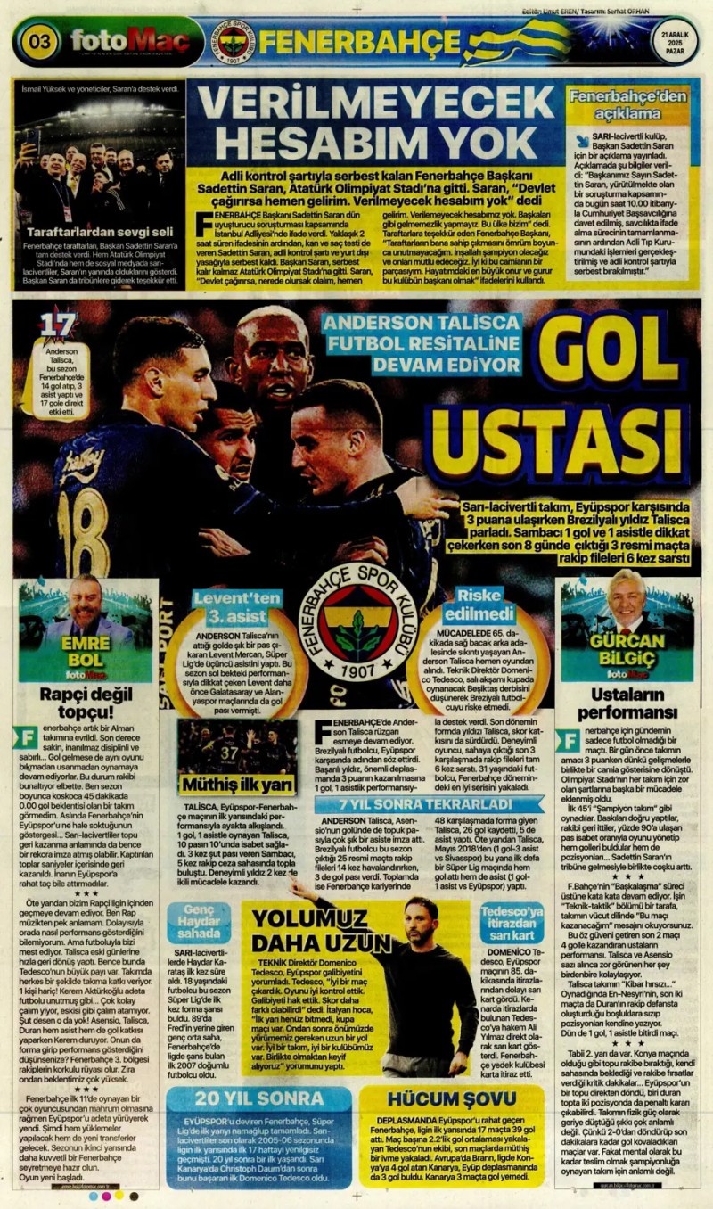 21 Aralık 2025 – Gazetelerde FENERBAHÇE