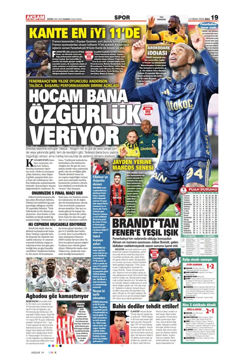 14 Nisan 2026 – Gazetelerde FENERBAHÇE