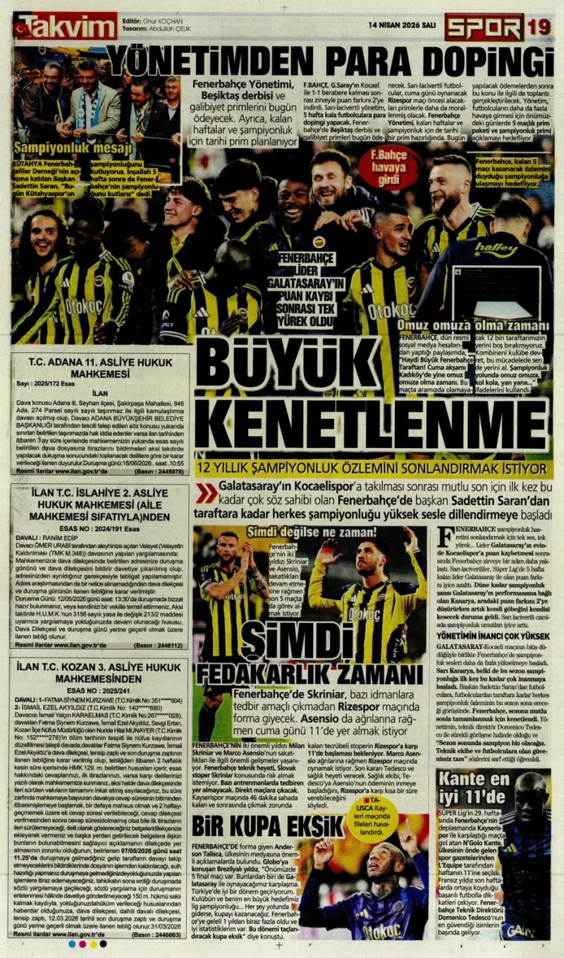 14 Nisan 2026 – Gazetelerde FENERBAHÇE
