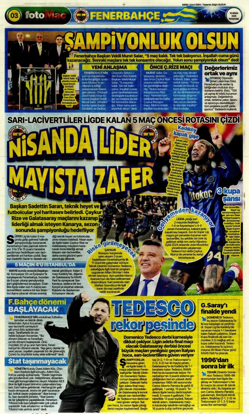 16 Nisan 2026 – Gazetelerde FENERBAHÇE
